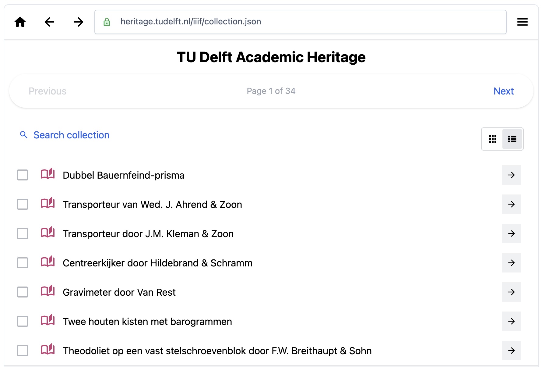 Given our location for the workshop today, where better to start than at TU Delft - you can navigate their IIIF collection from here: (https://heritage.tudelft.nl/iiif/collection.json )